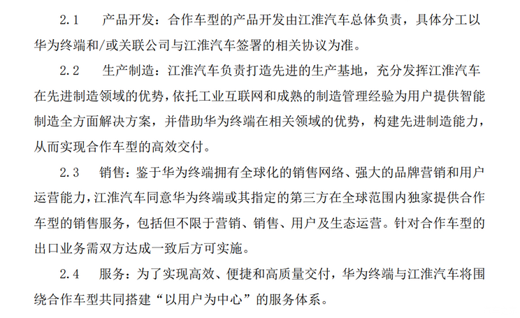 具体包括,双方合作车型的产品开发由江淮汽车总体负责,江淮汽车负责打造生产基地实现合作车型的交付。江淮汽车同意华为终端或其指定的第三方在全球范围内独家提供合作车型的销售服务。为了实现高效、便捷和高质量交付,华为终端与江淮汽车将围绕合作车型共同搭建“以用户为中心”的服务体系。