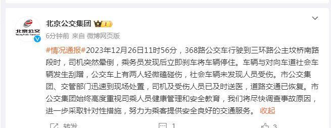 北京市368路公交车在三环路公主坟桥南行驶途中发生意外,司机突然晕倒导致公交车与对向车道的社会车辆发生刮蹭,造成两名乘客受轻伤。事故发生后,相关部门迅速处理,伤者及时送医,交通已经恢复正常。公交集团将调查事故原因并采取措施确保乘客安全。