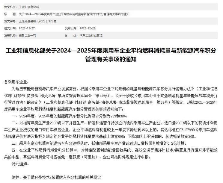 工业和信息化部宣布,为响应节能与新能源汽车产业的发展,2024年和2025年的新能源汽车积分比例将分别设定为28%和38%。该政策还包括对小规模生产商和进口商的积分要求放宽措施,以及对低油耗车型和采用节能技术的车型在燃料消耗量积分核算上的优惠。