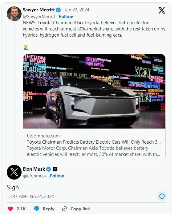 对于丰田章男的言论,特斯拉CEO马斯克也进行了回应,不过他的回复很简单,表示无奈和无语。此前,马斯克曾警告称,如果传统车企不迅速向电动汽车转型,就会被淘汰,就像当年的胶片巨头柯达被数码时代抛弃一样。