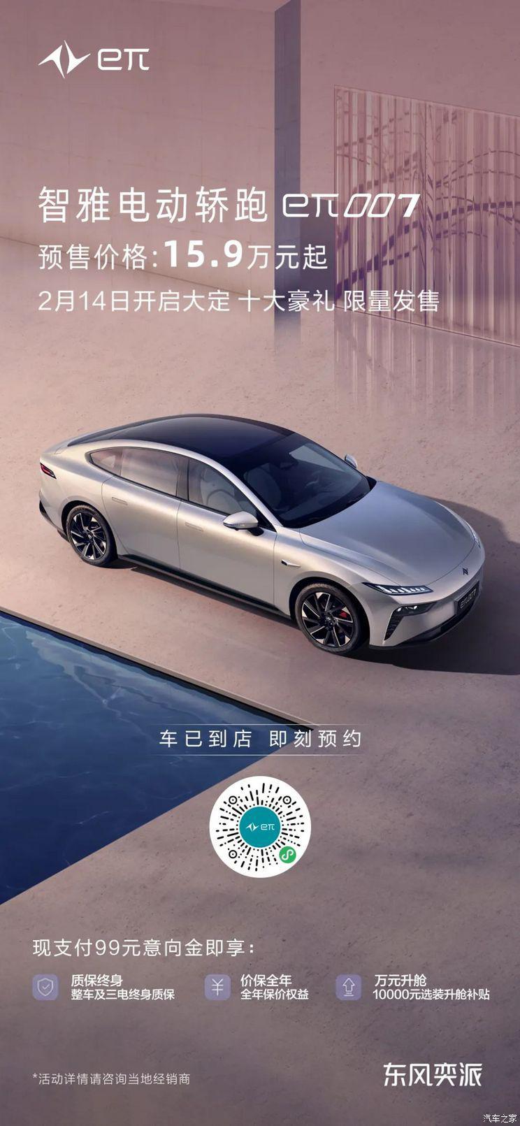 东风奕派eπ007,定位中大型轿车,将于2月14日开启大定,预售价格15.9万元起。新车采用轿跑设计,低风阻,搭载全液晶翻转仪表及超大中控屏,提供豪华配置如8点按摩座椅、智能香氛系统。动力上有增程和纯电版,四驱双电机最大400kW,0-100km/h加速3.9秒,续航可达1200km。预计2024年一季度上市。
