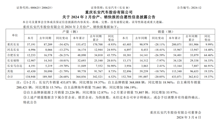 根据数据显示,1-2月,长安系中国品牌乘用车零售341952辆,同比增长62.4%;长安汽车自主品牌新能源零售89374辆,同比增长119.1%;长安汽车自主品牌海外零售75661辆,同比增长106.2%。