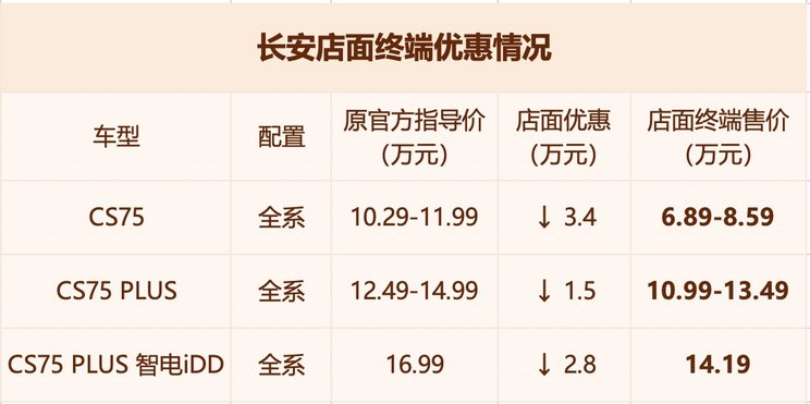 长安方面也有官降车型,但是王牌车型CS75系列不在其中,通过调查走访,CS75车型店面优惠高达3.4万元,优惠后6.89万元起;CS75 PLUS优惠1.5万元,优惠后10.99万元起;插混车型CS75 PLUS 智电iDD优惠2.8万元,优惠后14.19万元起。同时也有4000元的置换补贴。