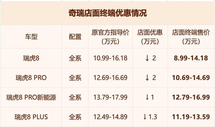 目前瑞虎8家族有三款车型在售,分别是瑞虎8、瑞虎8 PRO和瑞虎8 PLUS,其中瑞虎8店面优惠2万元,优惠后8.99万元起;瑞虎8 PRO店面优惠2万元,优惠后10.69万元起;瑞虎8 PRO新能源(插混)店面优惠1万元,优惠后12.79万元起;瑞虎8 PLUS店面优惠1.3万元,优惠后11.19万元起。除此以外,销售表示还有2万元的置换补贴,叠加在一起价格确实很有诱惑力。