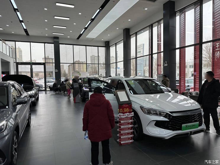 这次我们来到一个三线城市进行终端店面探访。作为降价车型的源头,首先我们来到了一家比亚迪王朝店,这家店位于一个较大的4S店园区,这里聚集了不少4S店。在10万元左右的SUV里,这次宋Pro DM-i荣耀版和元PLUS荣耀版都进行了官降,前者降2万元,后者降1.6万元,优惠后起售价分别为10.98万元起和11.98万元起,宋Pro DM-i荣耀版和元PLUS荣耀版还分别有2500元和2000元的置换补贴。