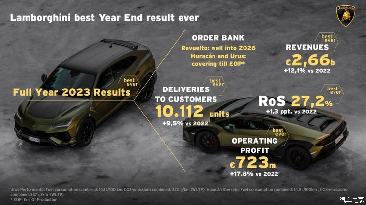 [本站 资讯] 日前,兰博基尼汽车公司总部发布财务报告,表明公司业绩持续增长的势头,并取得了有史以来最佳的财务业绩。2023年兰博基尼交付量首次超越10000台(具体为10112台),营业额达到26.6亿欧元,较2022年增长12.1%。