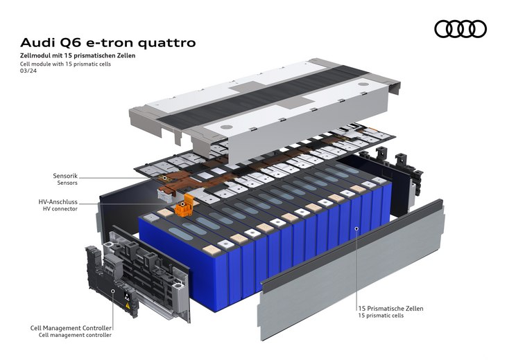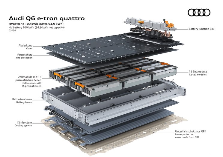 PPE平台的高压电池仅由12个模块、180个方形电芯组成,与过往使用的电池系统相比(如海外版奥迪Q8 e-tron搭载了36个模块和432个电芯)更加紧凑。同时,得益于800V电压系统,电池电芯容量显著增加,能量密度提高30%,车辆的续航里程与充电表现更加平衡出色。如此一来,电池所需安装空间更小、重量减轻15%,可以容纳更大的电池(Q6 e-tron电池100kWh),并且电池可以更好地集成在车辆防碰撞结构和冷却系统中。电池所需的电缆和高压连接器数量减少,对螺栓紧固件的需求量也显著降低。此外,模块间的电气连接更短,大幅降低损耗并减轻重量。PPE平台的高压电池实现更加高效地加热或冷却。
