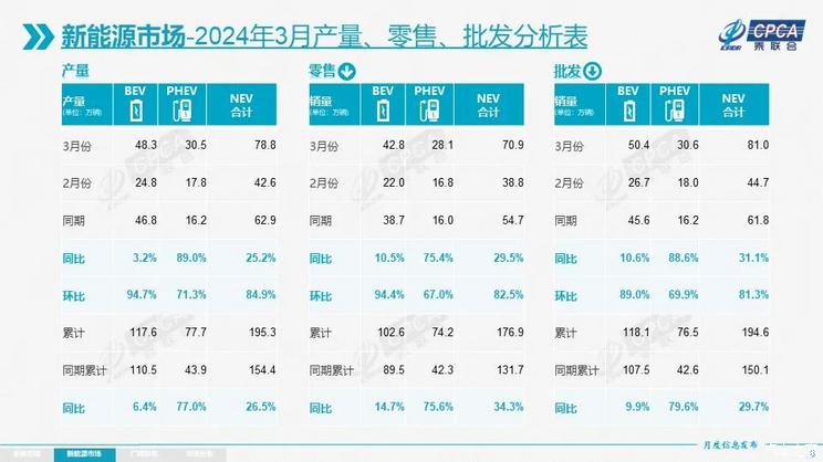 3月中国品牌零售93万辆,同比增长19%,环比增长51%。当月中国品牌国内零售份额为54.8%,同比增长6个百分点;2024年中国品牌累计份额55%,相对于去年同期增加5.4个百分点。3月中国品牌批发市场份额59.3%,较去年同期增长6.4个百分点;中国品牌在新能源市场和出口市场获得明显增量,头部传统车企转型升级表现优异,比亚迪、奇瑞汽车、吉利汽车、长安汽车等传统车企品牌份额提升明显。
