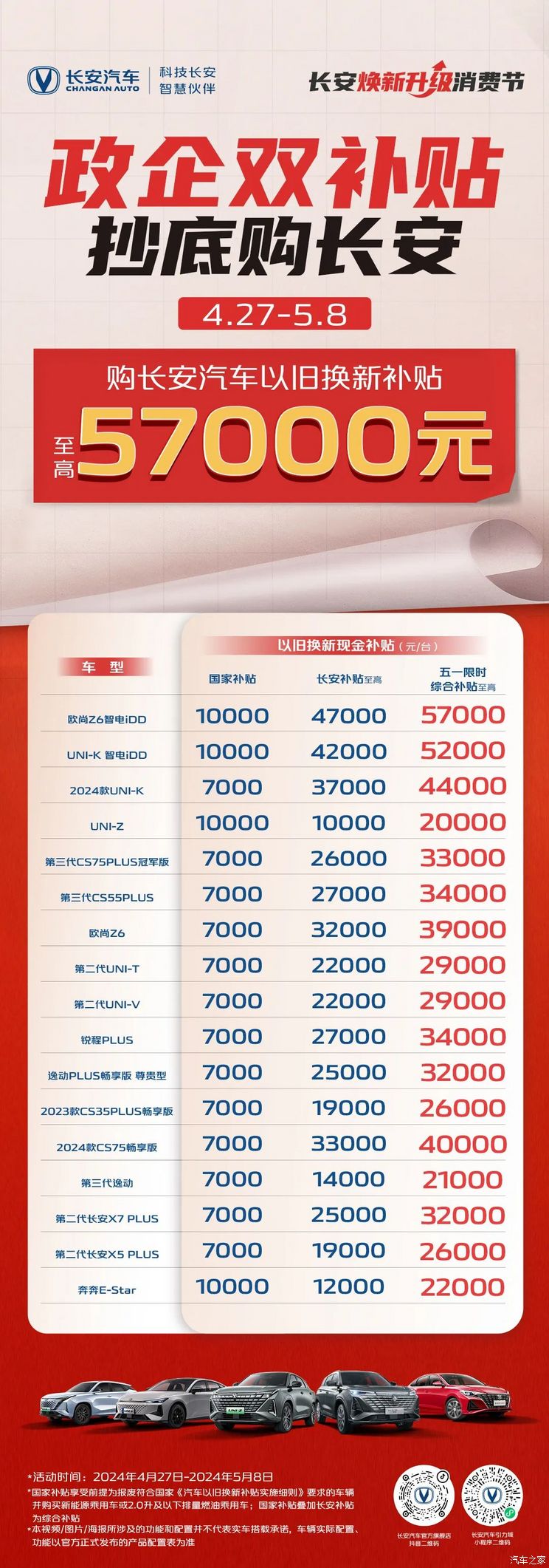 [本站 资讯] 日前,长安汽车官方推出以旧换新补贴活动,活动采取国家补贴+长安补贴的形式,共17款车型至高综合补贴5.7万元,活动时间为4月27日-5月8日。具体信息如下: