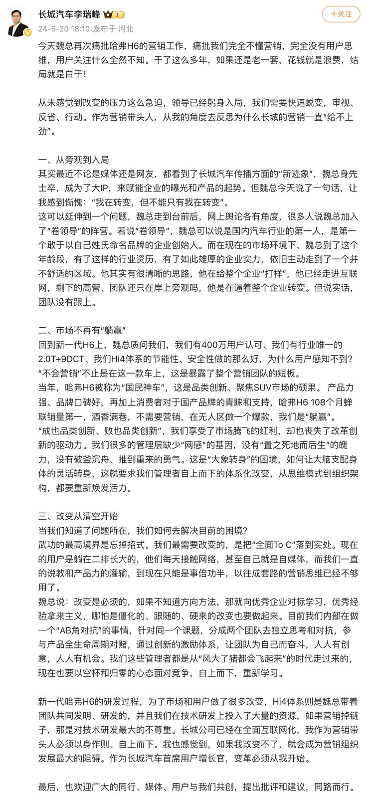 [本站 资讯]日前,长城汽车CGO李瑞峰在国内社交媒体上透露:魏总再次痛批哈弗H6的营销工作,痛批我们完全不懂营销,完全没有用户思维,用户关注什么全然不知。干了这么多年,如果还是老一套,花钱就是浪费,结局就是白干!具体如下: