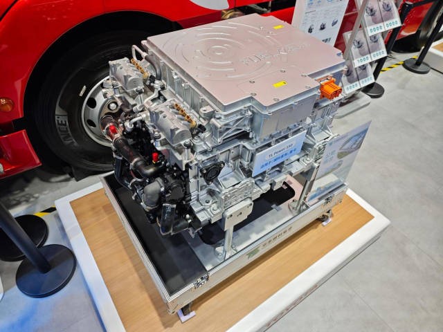 同时还有全球首次展出,额定功率为300kw的TL Power300燃料电池系统(双系统)的49t氢燃料电池牵引车。作为一款氢能双系统产品,其能在长途重载运输场景下,发挥很大作用。