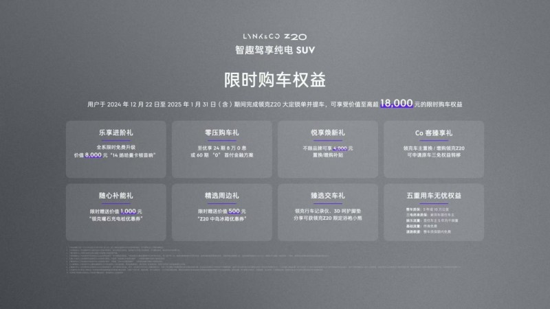 为回馈广大用户支持,领克Z20推出多重购车权益,在 2024年 12月22日至2025年1月31日(含)期间完成领克Z20 大定锁单并提车,可享受价值至高超18,0OO元的限时购车权益。