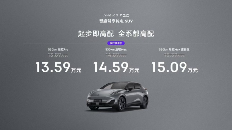 【2024年12月22日,上海】今日,领克首款纯电SUV领克Z20在上海正式上市,限时领享价13.59万元起,提供3款版型选择。作为领克首款纯电SUV,领克Z20深入洞察用户的出行焦虑,凭借让人一眼心动的Crush外观、驾乘兼享的Cool性能和乐趣的Chill空间,让都市年轻人群告别焦虑、舒缓压力,成为他们心中的“都市解压神车”,以及A级纯电SUV市场高品质座驾首选。从欧洲到中国,领克Z20展示出了领克在纯电领域的全球竞争力,它的正式上市,不仅代表领克纯电战略的全新里程碑,也标志着领克在践行“持续改变移动出行方式”的道路上开辟出崭新图景。