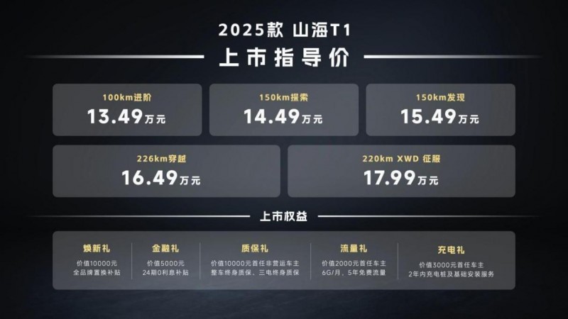 新车上市期间,用户可以享受焕新礼、金融礼、质保礼、流量礼、充电礼五大福利。旧车置换2025款山海T1还将享受厂补、国补双重优惠,国补换新价仅10.99万起,厂补换新价12.49万起。