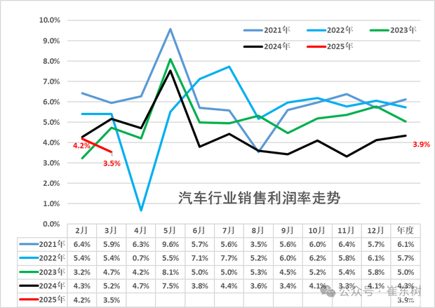 国家统计局5月27日公布的数据显示,2025年前四个月,国内汽车制造行业利润率刚过4%,处于历史低位。2021年至2024年,行业利润率逐年下滑,由6.1%降至4.3%。