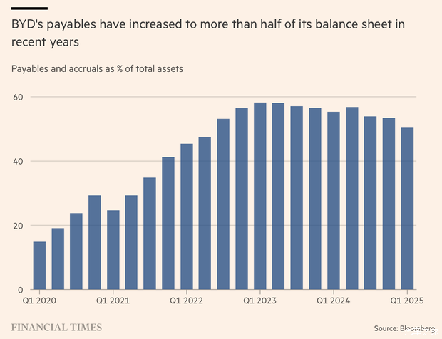另外一个数据是,比亚迪对供应商的应付款项在总资产的占比从2020年逐年攀升,自2022年Q2开始至今,占比已经超过了50%。