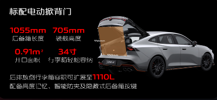令人惊喜的是,电动掀背门拥有远超传统三厢轿车的0.91m²超大开口,后备箱长度达1055mm,装载高度705mm,轻松容纳34英寸大件行李,后排座椅放倒后,后背箱空间进一步扩展,长度可达1.8m,容积扩至1110L,再多装备都能一步到位,同时配备高度记忆、智能防夹及隐藏式后备箱按键,大包小包不再手忙脚乱。