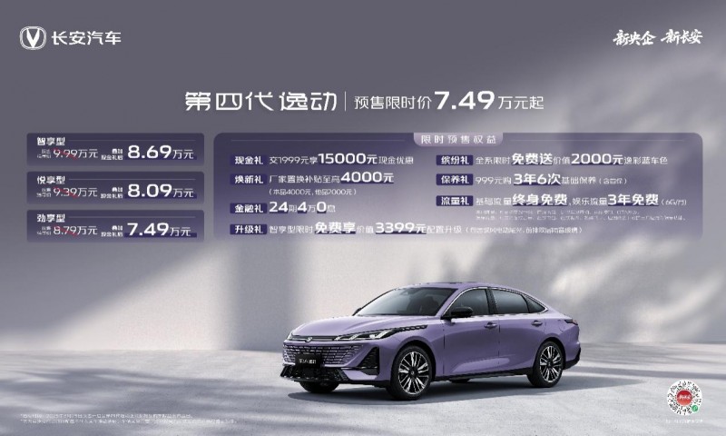 此外,即日起至第四代逸动正式价格及购车权益发布当日,购买第四代逸动的用户可享丰富的限时预售权益。其中现金礼:交1999元享15000元现金优惠;焕新礼:厂家置换补贴至高4000元(本品4000元/他品2000元);金融礼:24期4万0息;升级礼:智享型限时免费享价值3399元配置升级(包含驭风电动尾翼、前排双层隔音玻璃);缤纷礼:全系限时免费送价值2000元逸彩蓝车色;保养礼:999元购3年6次基础保养(含首保);流量礼:基础流量终身免费,娱乐流量3年免费(6G/月)。
