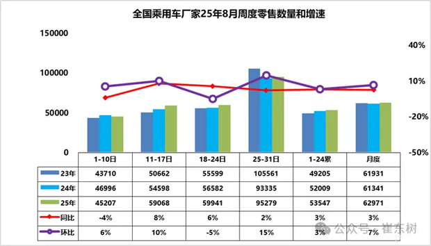8月第4周乘用车市场日均零售9.5万辆,同比去年同期增2%,较上月同期增15%。