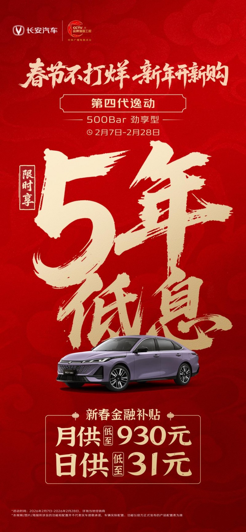 结语:逸动以长安汽车强大的体系赋能、对用户需求的深刻洞察,以及”全球智能家轿新标杆”的全面实力,持续巩固在自主燃油轿车领域的领军地位。新的一年,第四代逸动强势开局,正以更昂扬的姿态,陪伴更多中国家庭驶向美好生活。春节将近,即日起至2月28日,恰逢长安汽车“春节不打烊 新年开新购”活动正在推进,第四代逸动推出多重购车礼遇,500Bar劲享型限时享5年低息,新春金融补贴后月供低至930元、日供低至31元,让”开新车、过大年”的美好愿望触手可及。对于追求高价值体验的家庭而言,冠军之选,正当其时。