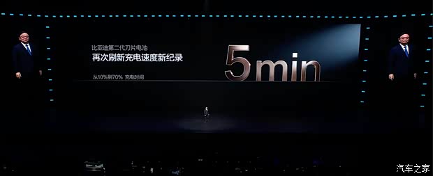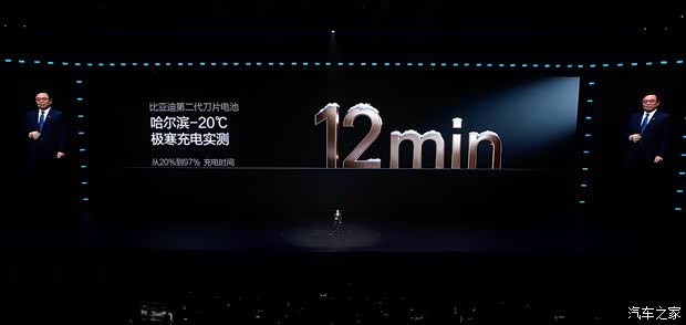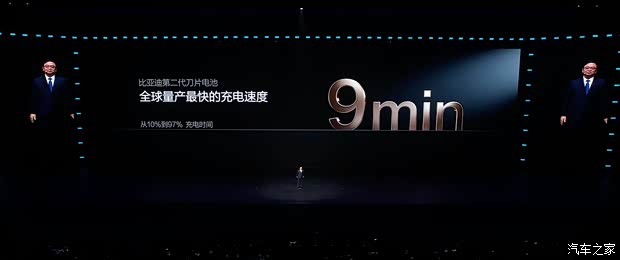 在充电速度方面,比亚迪第二代刀片电池从10%-70%充电时间只要5分钟,从10%-97%充电时间只要9分钟,在零下20度极寒情况下,20%-97%充电实测为12分钟,零下30度只比常温多3分钟,20%-97%充电实测同样为12分钟。第二代刀片电池在普通充电桩充电速度比普通车型快30%-50%。
