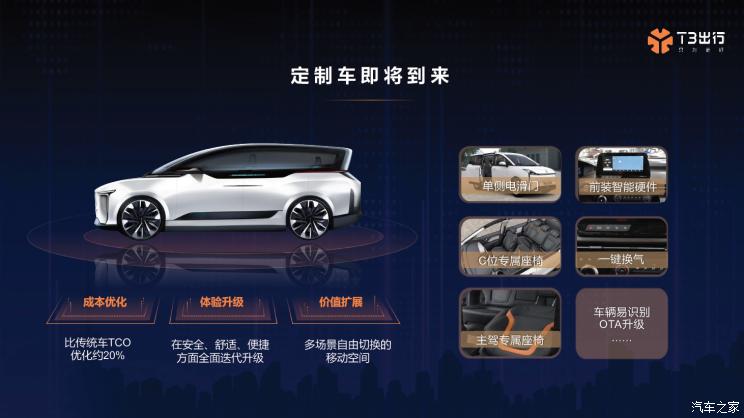 根据官方信息显示,该款T3出行定制车自然是针对网约车使用场景做出设计,其将在使用成本、安全/舒适性以及多场景自由切换等方面做出优化,将配置单侧电滑门、主驾驶位/乘客座位专属座椅、一键换气、OTA远程升级等配置。