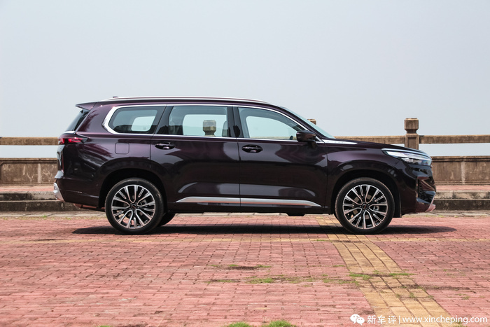 车身侧面的窗沿和腰线都非常平直,轮拱造型也有明显刻画,再结合庞大的尺寸,整车看起来非常阳刚。20英寸轮毂的尺寸与车身配合得可谓恰到好处,没有一个劲地用过分大的轮毂,轮胎为245/45R20的马牌MC6轮胎,必须好评。