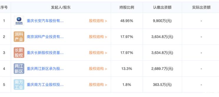 据了解,除了长安汽车持有电动汽车部门48.95%的股份外,南京润科产业投资有限公司持有该部门17.97%的股份,重庆长新股权投资基金合伙企业持有该部门17.97%的股份,重庆两江新区承为股权投资基金合作企业持有该部门13.3%的股份,重庆南方工业股权投资基金合伙企业持有该部门1.8%的股份。