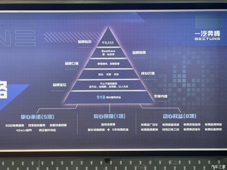 除此之外,奔腾还发布了全新服务品牌标识:BestCare挚・心关怀。以挚诚相伴,全程悠享为口号,匠心、关爱和伙伴为核心价值观,通过不止于售后服务的全方位、全周期、全渠道、以人为本作为品牌定位。为践行这一定位,奔腾发布了518挚心服务权益,将包含三大方面15项服务。包括新车30日免费退换、四季延时服务、全程快速救援、45分钟保养、纯正备件供应、整车终身质保、5年免费机油、免费回厂洗车、免费基础流量、免费添加油液、免费检测焕新、免费易损件更换、特殊日免工时、免费事故拖车、免费轮胎质保。从更多方面,带给用户更加安全、便利、放心的保障。