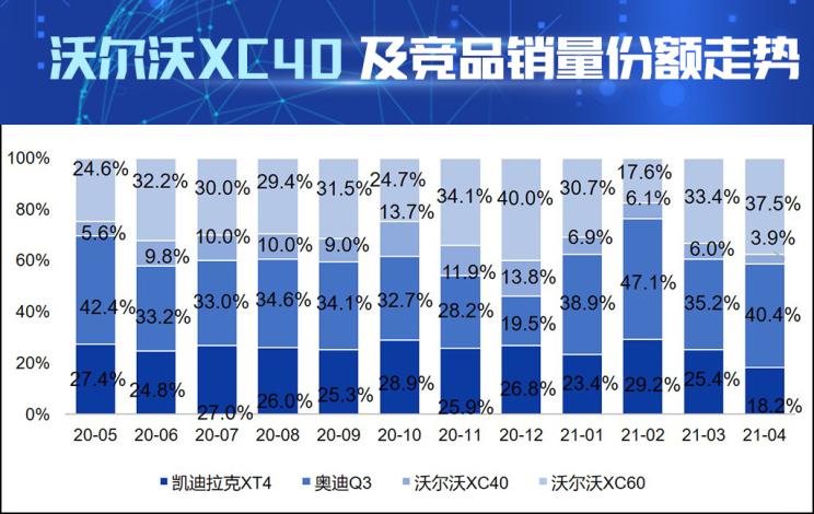 [本站 资讯] 一直以来,紧凑型SUV市场的竞争激烈异常,对身处这一细分市场的产品实力提出不小要求。自国产沃尔沃XC40于2019年5月推出以来已有2年的时间,2021款车型的上市也有近一年的时间,现如今,这款车在国内紧凑型SUV的竞争力如何?有着怎样的销量走势和用户画像?本期AI看市场我们来看一下沃尔沃XC40的市场表现。
