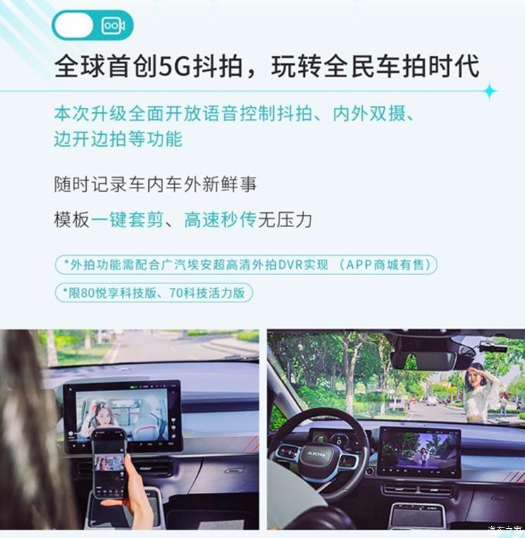 内拍功能限70/80悦享科技版、70科技活力版。外拍功能需配合广汽埃安超高清外拍DVR实现(APP商城有售)。在完成外拍功能设备添加后,就可以通过语音控制,比如说:“我要拍照”、“我要录像”、“打开录音”、“拍摄视频”等记录精彩瞬间。