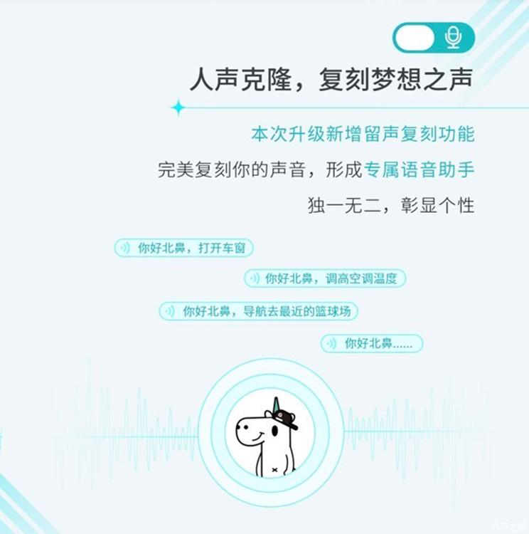 本次升级新增留声复刻功能,可将你自己或家人朋友的声音复刻进车机,形成专属语音助手。花10分钟的时间就可以训练出用户的完整音库,并将任意文本转换成用户的声音。