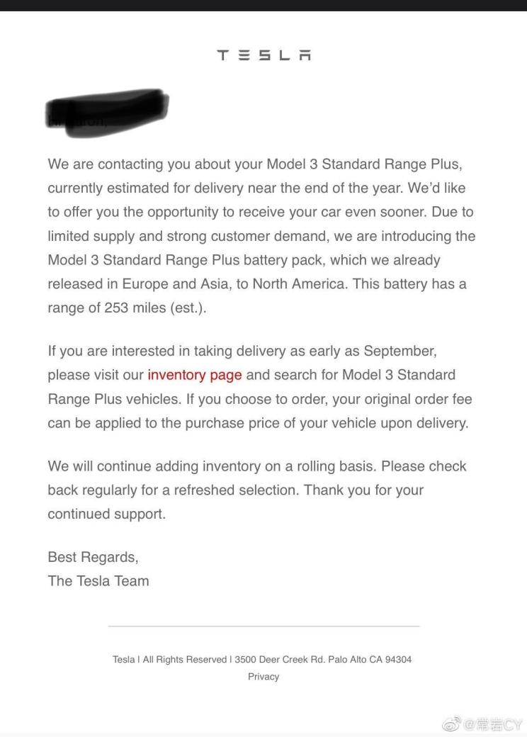 特斯拉的客户购买新车,都是采用线上预订的方式,通常需要一定时间的排队等待提车。最近,美国已经预订特斯拉Model 3的用户,收到了一封邮件,如果想提前拿车,可以选择来自中国生产的搭载磷酸铁锂电池的Model 3。相比三元锂电池的Model 3,磷酸铁锂电池Model 3续航里程从263英里(约合423公里)下降到253英里(约合407公里),但是价格仍然维持在3.999万美元(约合人民币25.9万元)不变。